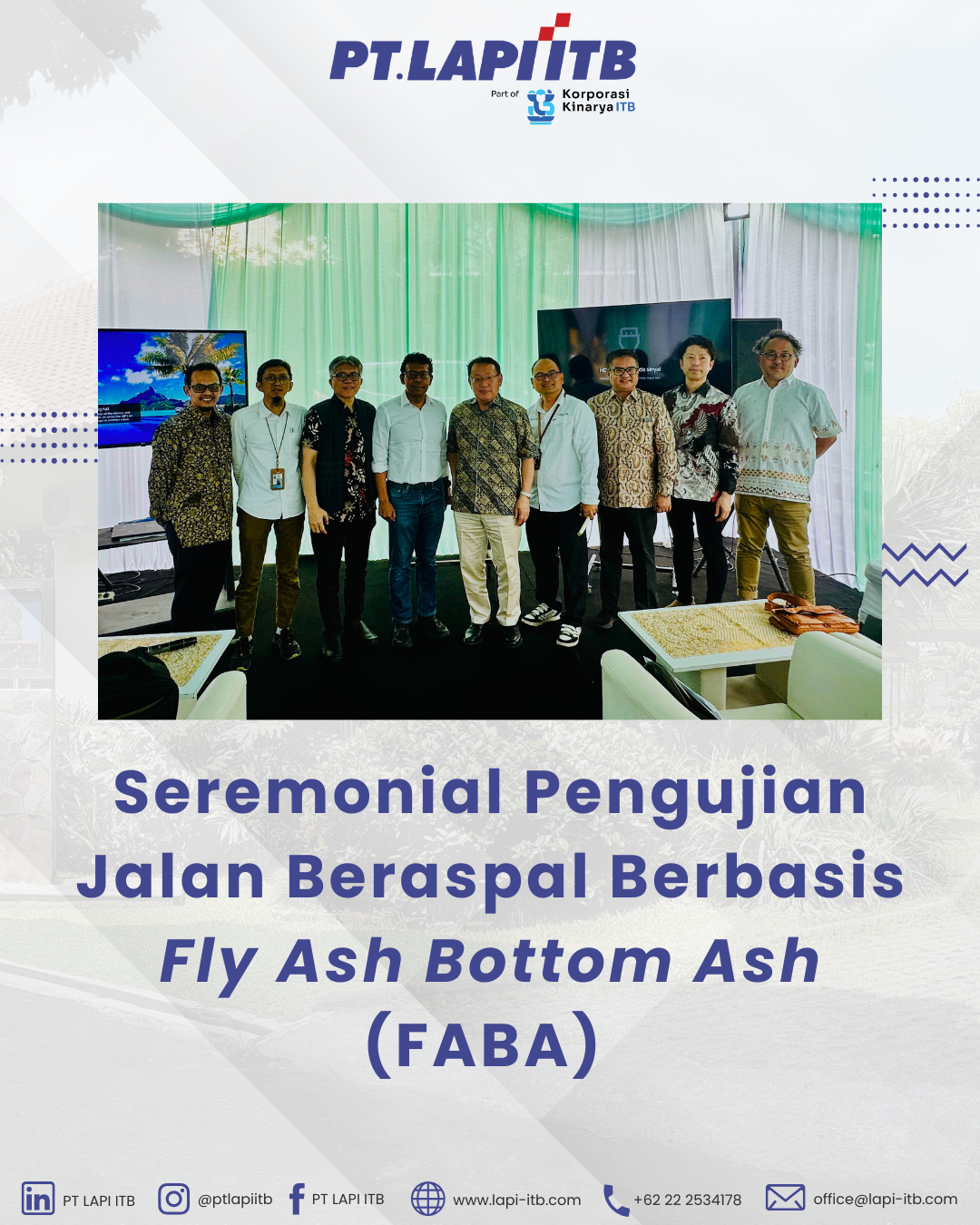 On April 21, 2026, PT LAPI ITB, together with FKG Corp., with full support from the Faculty of Civil and Environmental Engineering (FTSL) at Institut Teknologi Bandung, held a ceremonial testing of an asphalt road utilizing Fly Ash Bottom Ash (FABA) as part of a collaborative effort to advance sustainable material innovation in the infrastructure sector.