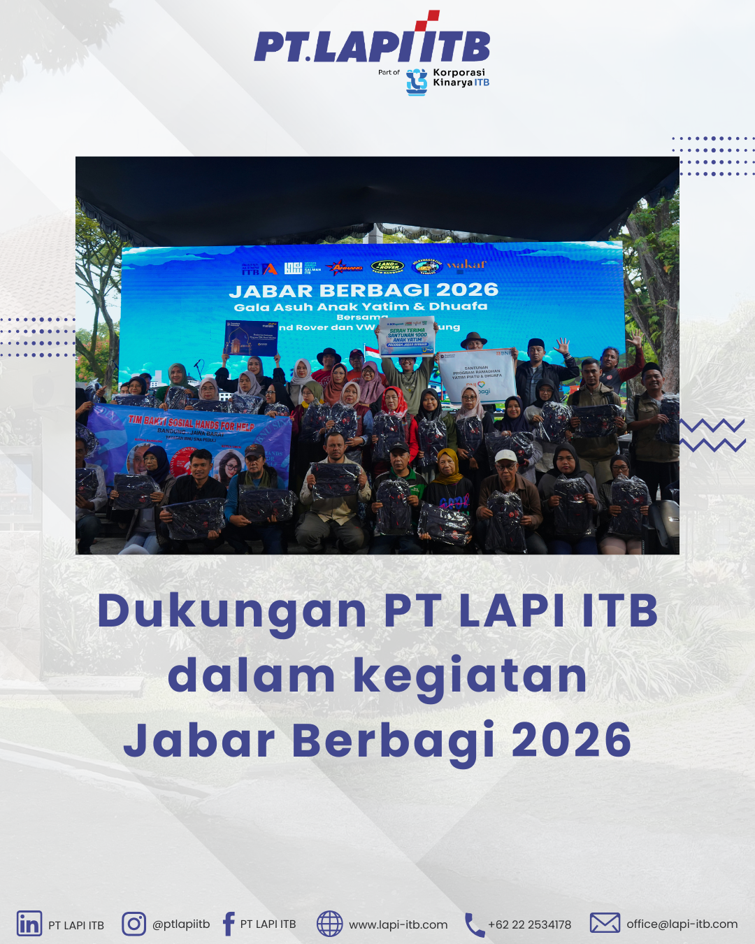 PT LAPI ITB is proud to contribute to the Jabar Berbagi 2026: Gala for Orphans and the Underprivileged as a tangible expression of the company’s commitment to social responsibility and sustainable development. Through collaboration with the Land Rover community and VW Club Bandung, this initiative serves as an important momentum to strengthen the values of compassion, togetherness, and cross-sector synergy in delivering direct benefits to those in need.
